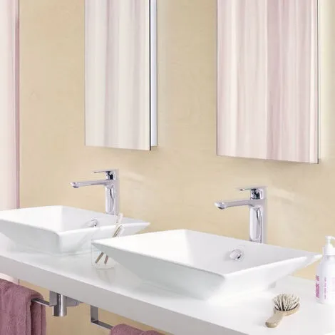 Débit limité à 5 l/mn Aérateur discret et anti-calcaire Corps lisse Flexibles tournants Sans bonde de vidage ni tirette