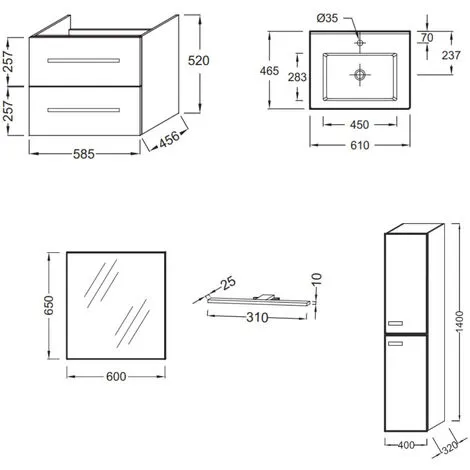Caractéristiques techniques du lot meuble vasque JACOB DELAFON Ola Up avec miroir et spot