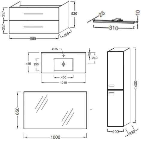 Caractéristiques techniques du lot meuble vasque JACOB DELAFON Ola Up avec miroir et spot