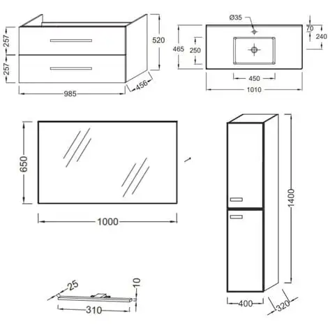 Caractéristiques techniques du lot meuble vasque JACOB DELAFON Ola Up avec miroir et spot