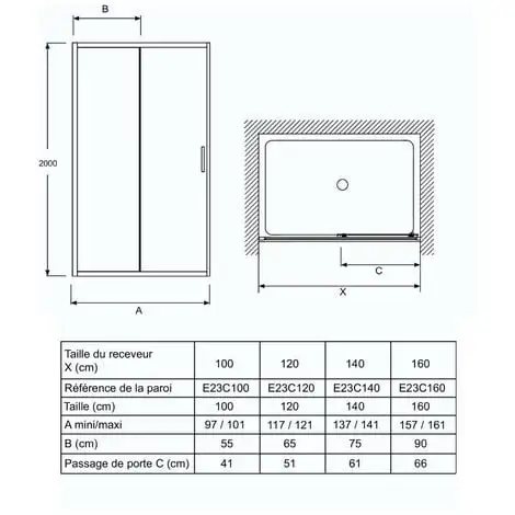 La paroi de douche l’Ingénieuse est disponible en plusieurs dimensions :