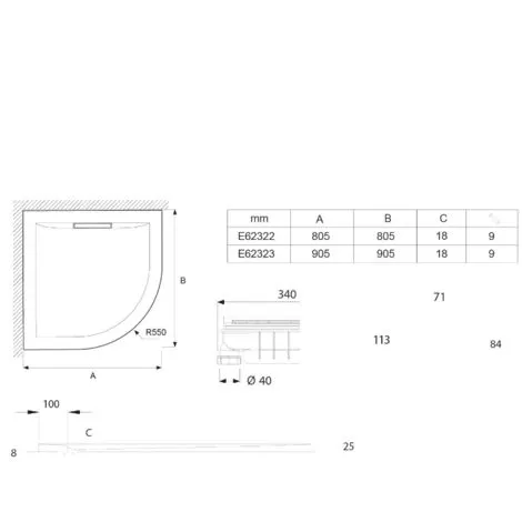 Dimensions disponibles pour le receveur quart de rond Jacob Delafon Haut de gamme Flight Pure :