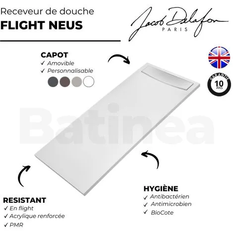Le Flight Neus est un bac de douche extra-plat de la marque Jacob Delafon qui vous séduira. Le receveur douche Jacob Delafon est tendance et s adapte à n’importe quelle salle de bain, et cela grâce à toutes ses tailles disponibles et son design. Le receveur de douche extra-plat, antibactérien et léger est idéale pour une douche italienne. Fabriqué en Grande Bretagne, il vous surprendra avec ses finitions épurées.