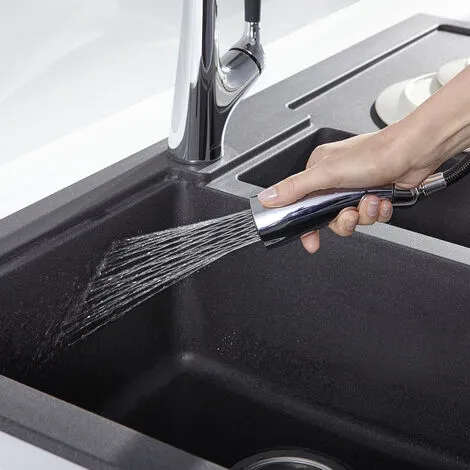 Douchette extractible : La douchette est montée sur rotule et permet une manœuvre souple et facilitée