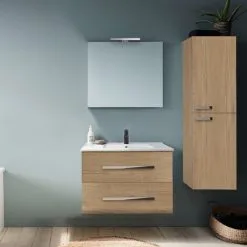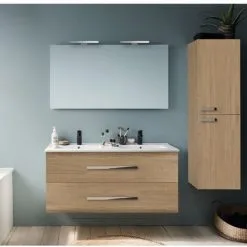 Meuble Lavabo Double Vasque JACOB DELAFON Ola Up + Colonne De Salle De Bain + Miroir Et Spot, Chene